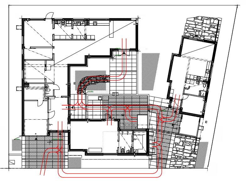 Ensimmäinen asia, mitä tarkensimme oli hulevesisuunnitelma. Piha-alue tulee olemaan pääosin kivetty, jotta siellä pystyy liikkumaan pyörätuolilla. Tämän vuoksi imeytettävä alue tontilla tulee melko pieneksi. Saimme poikkeamaluvan tarkkojen perusteluiden jälkeen. Oheinen kuva kertoo, missä pyörätuolireitit kulkevat pihalla.